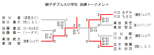 | 高畑 航太 高畑 葵 (若草ジュニア) | ○ 21- 0 21- 8 | ○ 21- 2 21- 5 | 1 | |